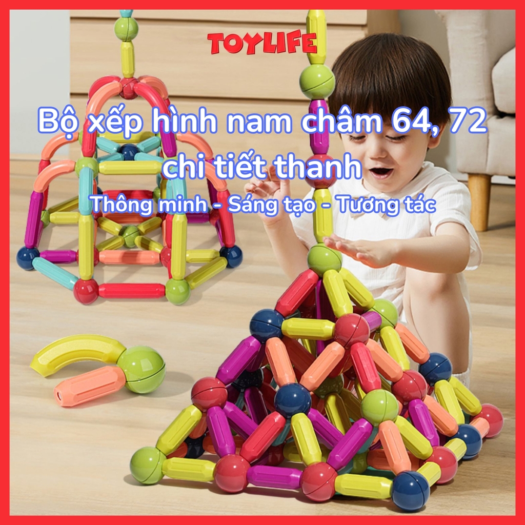 Bộ xếp hình nam châm 64, 72 chi tiết thanh đồ chơi xếp hình nam châm từ tính sáng tạo thông minh cho bé 1 2 3 4 5 6 tuổi